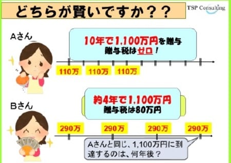 10年間という長い時間、基礎控除の枠内に縛られダラダラと贈与を続けるのも一策でしょう。しかし、贈与税という名の手数料を払って、4年でほぼ同額(1,160万円)の資金移動ができるBさんは時間という有限のリソースを限りなく有効活用した人といえないでしょうか。